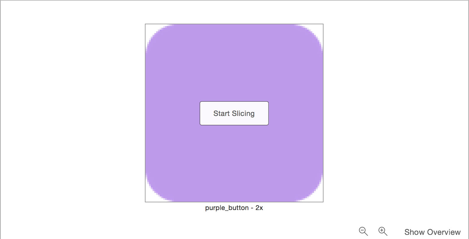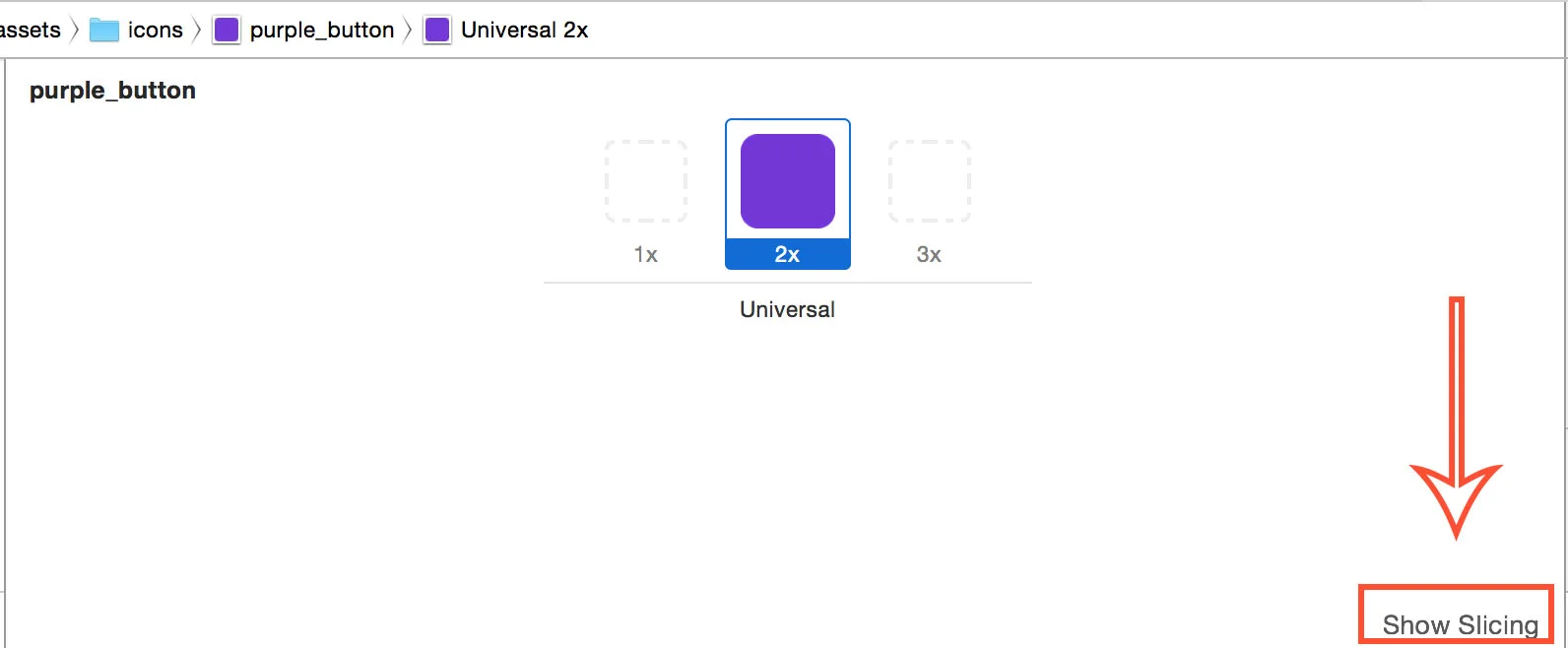 Thankfully, we don't even need code to have this happen due to the slice and dice enhancements in Xcode's Asset Catalogs. First, go to the bottom right corner of your image's screen in Xcode and click on 'Show Slicing':